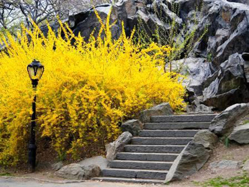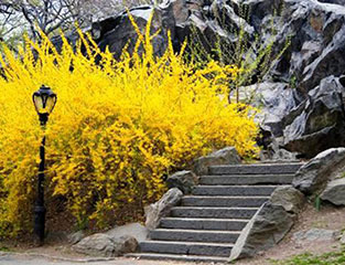 The softness of Spring's first blooms coordinate beautifully with this weathered granite stairway...
